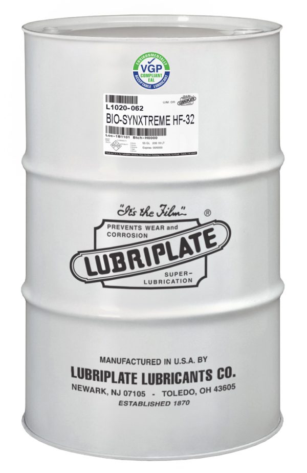 The LUBRIPLATE BIO-SYNXTREME HF Series are high performance hydraulic fluids designed for demanding industrial and marine (Vessel General Permit) applications requiring environmental sensitivity, water solubility, fire resistance, and excellent anti-wear properties over wide temperature ranges. These Polyalkylene glycol (PAG) based fluids, which are available in three viscosity grades, are anhydrous (water-free). LUBRIPLATE BIO-SYNXTREME Hydraulic Fluids do not break down to form sludge, and they do not hydrolize in the presence of water. Furthermore, because of their high viscosity indices and excellent low temperature characteristics, one viscosity grade fluid may replace two or three viscosity grades.