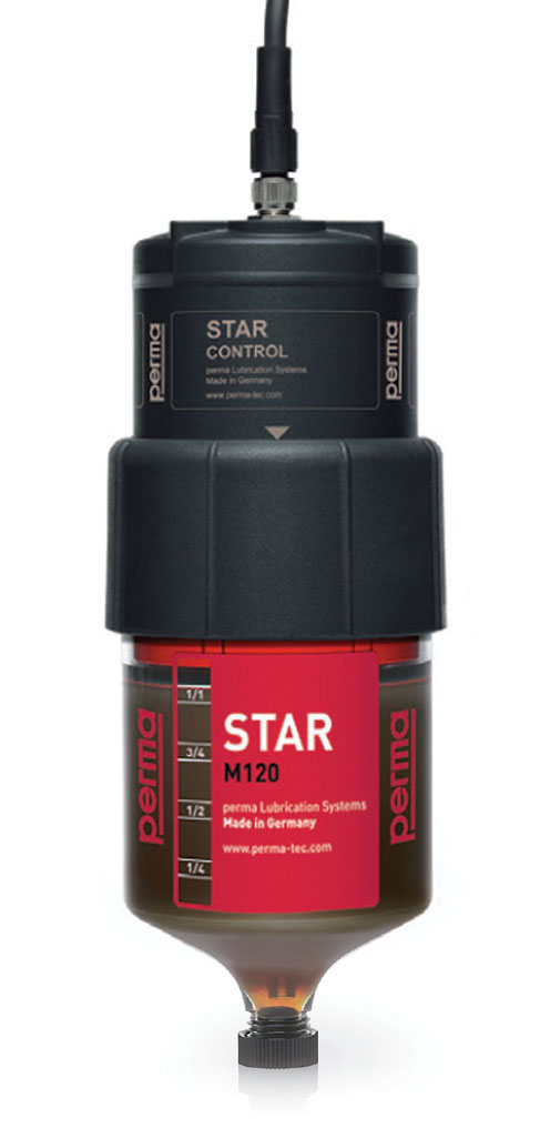 perma STAR VARIO operates fully automatically, independent of temperature and very precisely. The system consists of an electromechanical drive unit, a lubricant canister (LC) with a lubricant volume of 60, 120 or 250 cc and a battery pack. The desired discharge period and LC size can easily be selected with the push button and are immediately visible in the display. The current operating status is indicated on the display and via the all around LED signal lights (red/green), which are visible from a distance.