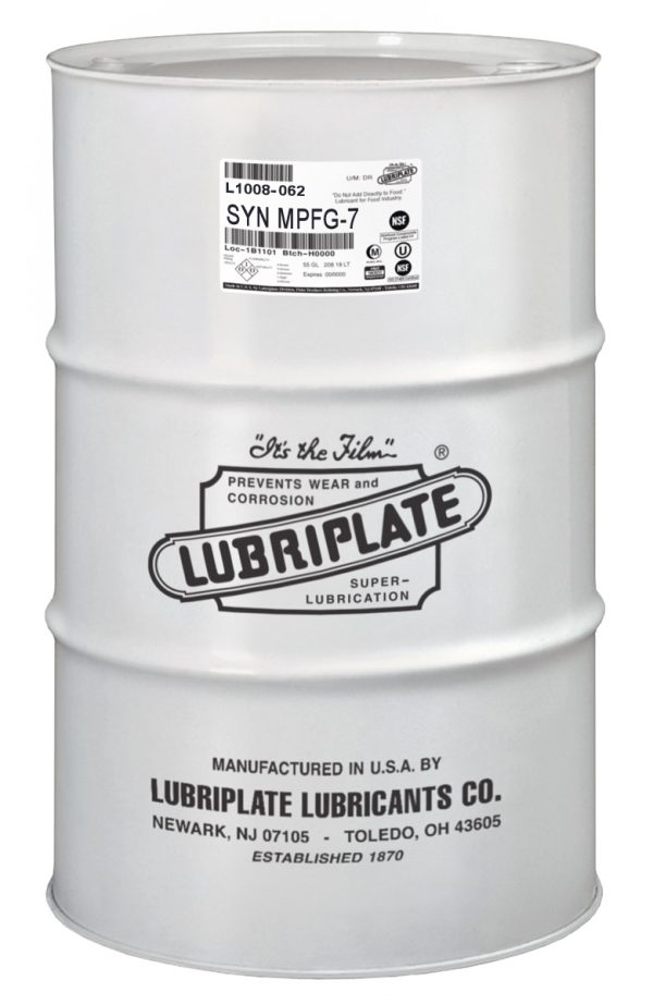 LUBRIPLATE SYN MPFG-7 is a 100% polyalphaolefin (PAO) synthetic fluid. It is an NSF International H-1 Registered* food grade product for applications in the food processing industry. LUBRIPLATE SYN MPFG-7 is recommended to lubricate plastic modular wear strips and sprockets; as a barrier fluid; and for applications where extreme low temperature fluid is required.